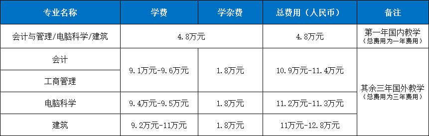 1. 以上费用包含学费、学杂费,费用每年根据汇率会有微调,以入学当期收费标准为参考。