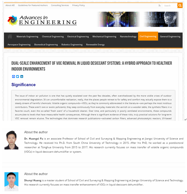 本网讯 近日,土木与测绘工程学院符黄喜副教授课题组发表在Applied Thermal Engineering期刊上的论文“A hybrid technology for enhancing VOC transfer in liquid desiccant dehumidifiers: Combining surfactant and internal cooling”被国际著名科技机构Advances in Engineering(AIE)遴选为关键科学文章,并以“Dual-Scale Enhancement of VOC Removal in Liquid Desiccant Systems: A Hybrid Approach to Healthier Indoor Environments”为题进行了专题报道。土木与测绘工程学院2022级硕士研究生黄顺意为论文第一作者,符黄喜为通讯作者。