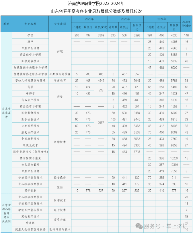 济南护理职业学院山东省内各专业近三年录取最低分数及位次