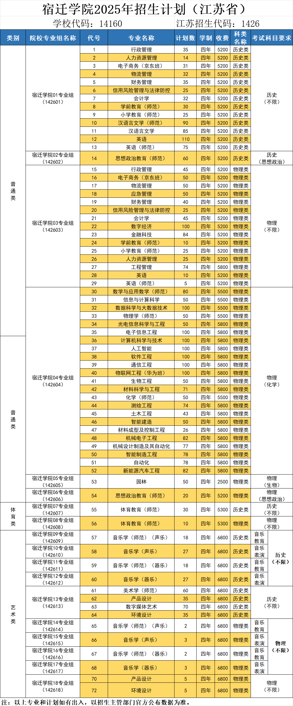 宿迁学院2025年招生计划(江苏省)