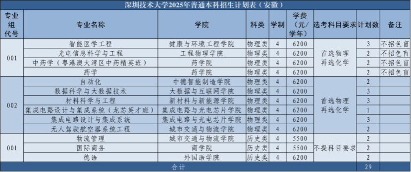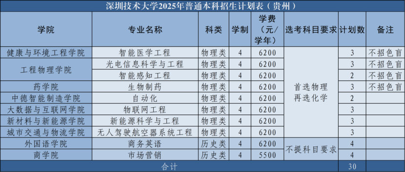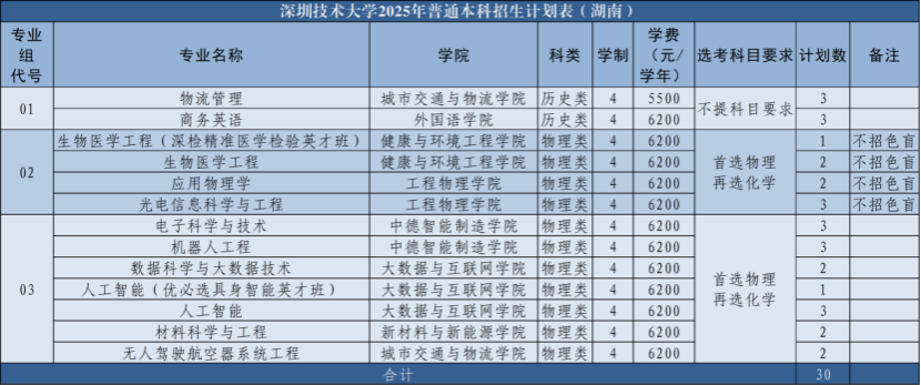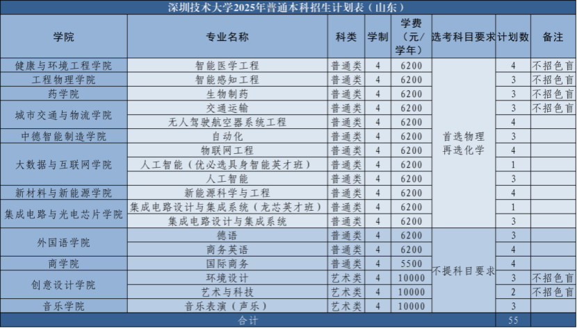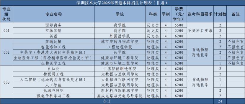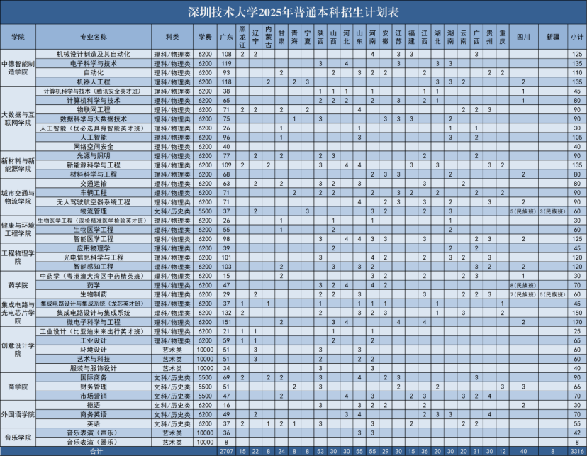 深圳技术大学2025年计划面向广东、黑龙江、辽宁、内蒙古、甘肃、青海、宁夏、陕西、山西、河北、山东、河南、安徽、江苏、福建、江西、湖北、湖南、云南、广西、贵州、重庆、四川、新疆等24个省份招生,计划招生3350人。