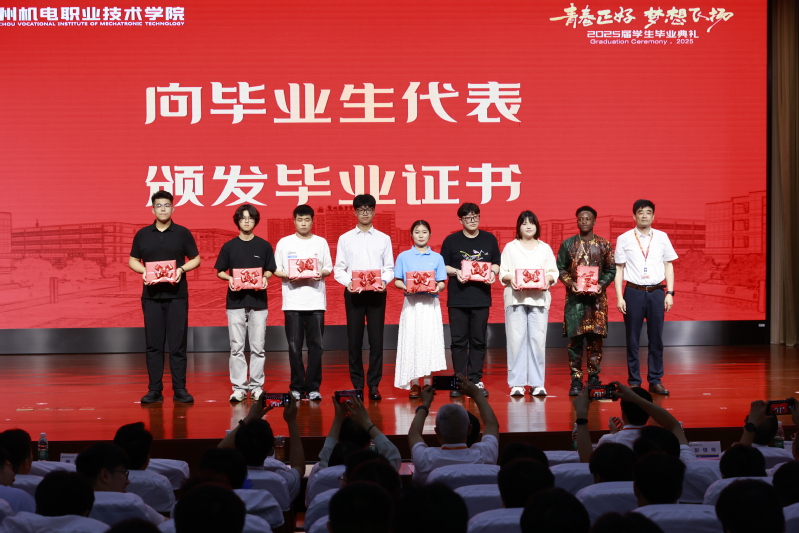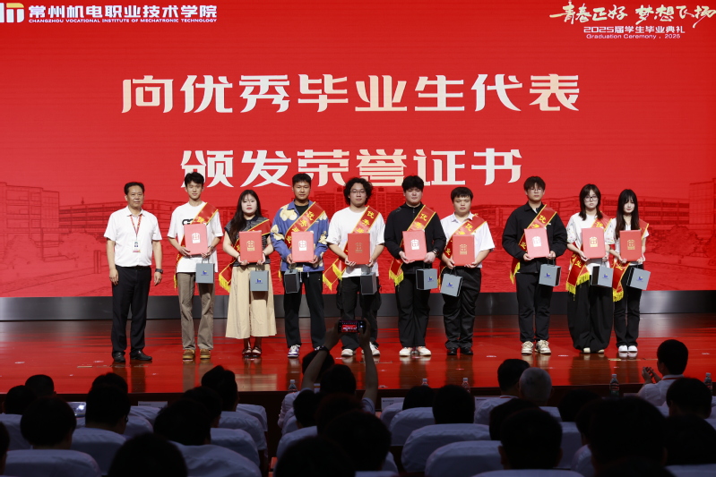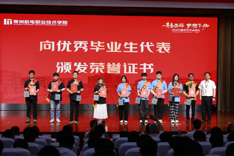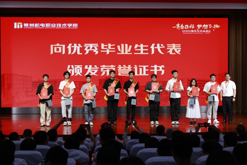党委副书记朱平宣读优秀毕业生表彰决定。党委书记沈琳为优秀毕业生代表颁发荣誉证书,校长许朝山为毕业生代表颁发毕业证书。