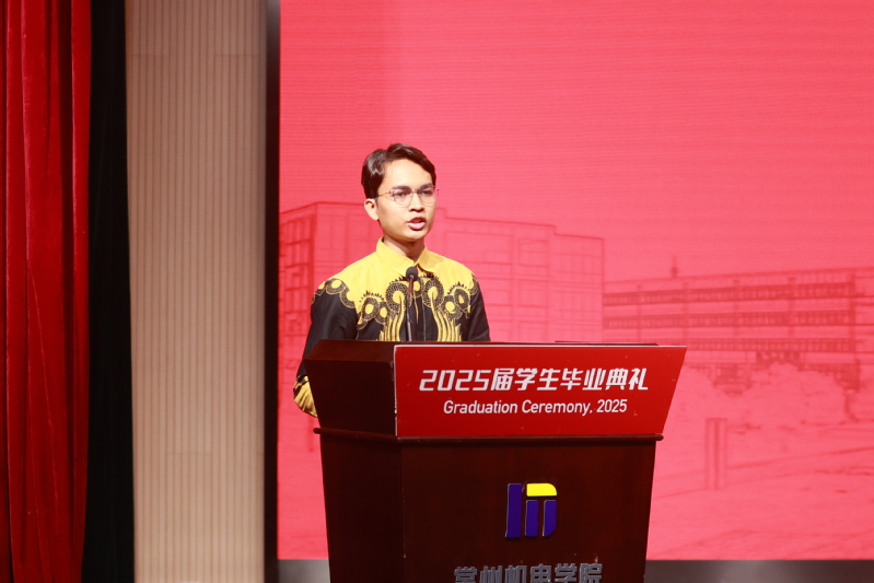印度尼西亚留学生迪亚作为留学毕业生代表发言。他感谢学校和老师三年来的悉心教导和精心栽培,希望把中国学到的知识和经验带回祖国,服务世界发展,讲好中国故事,传播中国声音。