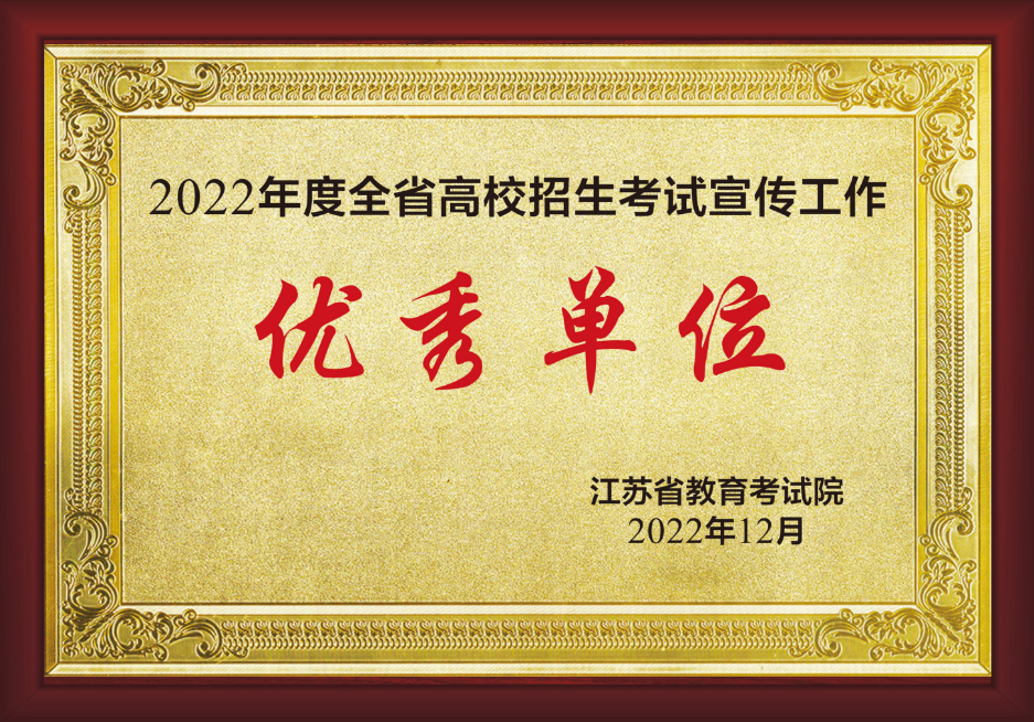 近日,江苏省教育考试院发文对2022年招生考试宣传工作表现突出的单位进行表彰,我校荣获2022年度全省高校招生考试宣传工作“优秀单位”称号。