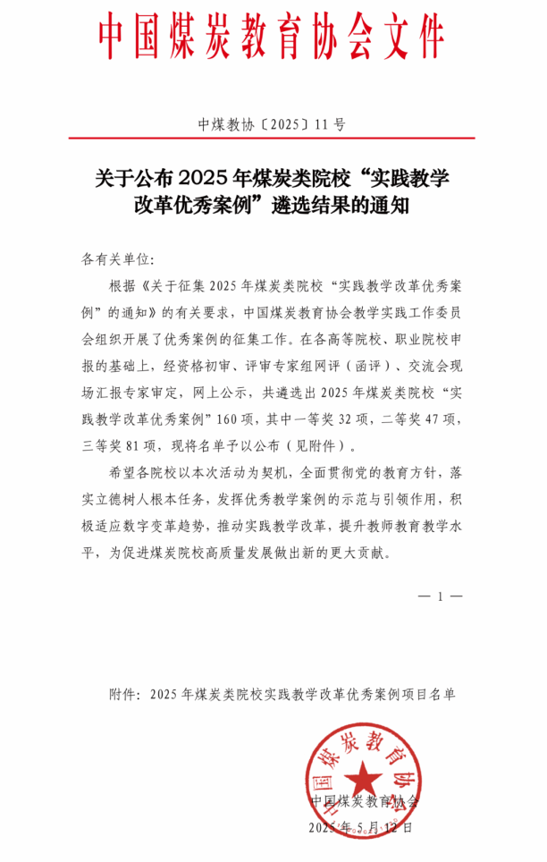 近日,由中国煤炭教育协会教学实践工作委员会组织的2025年度煤炭类院校“实践教学改革优秀案例”遴选结果揭晓。该奖励根据《全国煤炭行业教学成果奖评选办法》,面向实践教学改革方面取得显著成绩,形成具有创新性、典型性、实效性和示范性的做法或举措而设置,在全国煤炭院校中组织开展评选,每4年评审一次,本年度评选是首届评选。