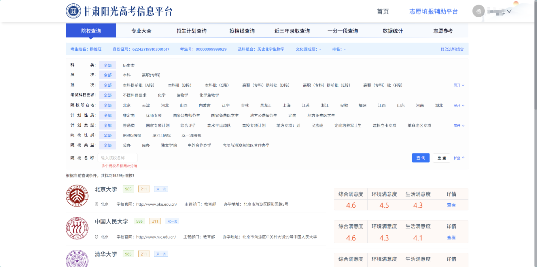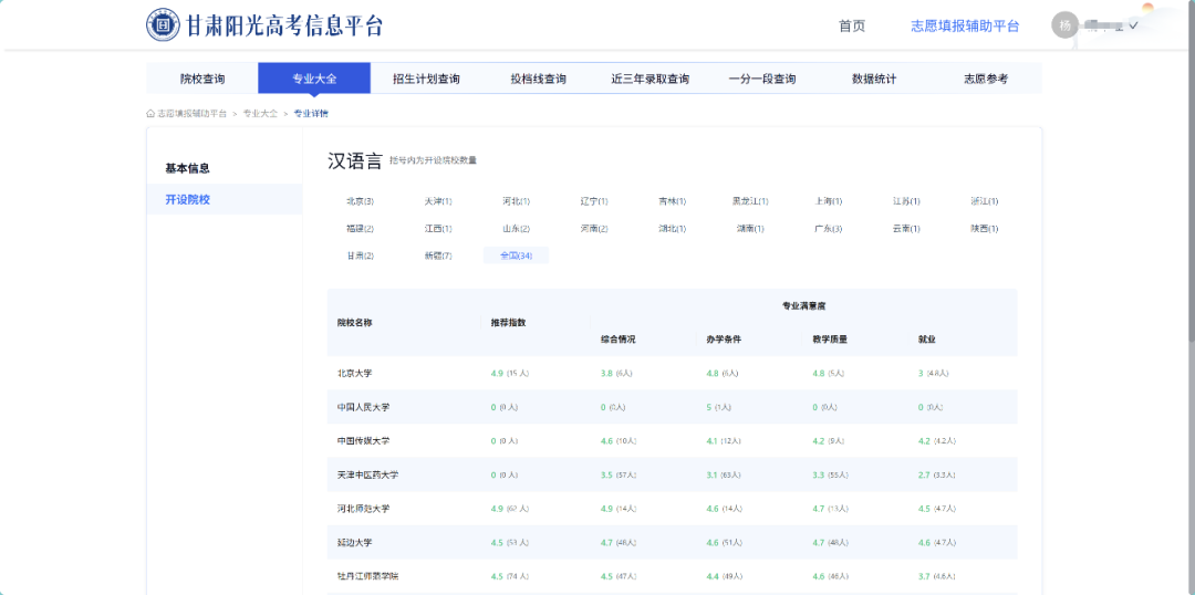 院校查询列表页面为考生提供所有在甘招生院校信息,包括院校官网、院校所在城市、主管部门、办学地址、院校满意度等。