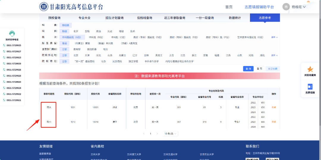 招生计划查询页面为考生提供2025年在甘招生院校在全省的招生计划信息,包含院校代号、院校名称、层次、批次、科类、专业组信息、专业名称 、考试科目要求、收费标准、学制等信息。招生计划按照“院校专业组+专业”模式分层展示,方便考生查看。考生可根据科类、层次、批次、考试科目要求、院校所在地、计划性质、计划类型、院校性质、院校类型、新增院校及专业多维度查询2025年招生计划。同时也支持输入院校名称、专业名称及最低分或最高分位次进行查询。同时智能链接往年院校、专业录取数据。