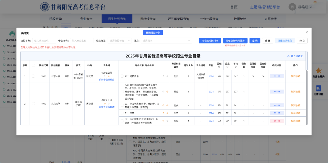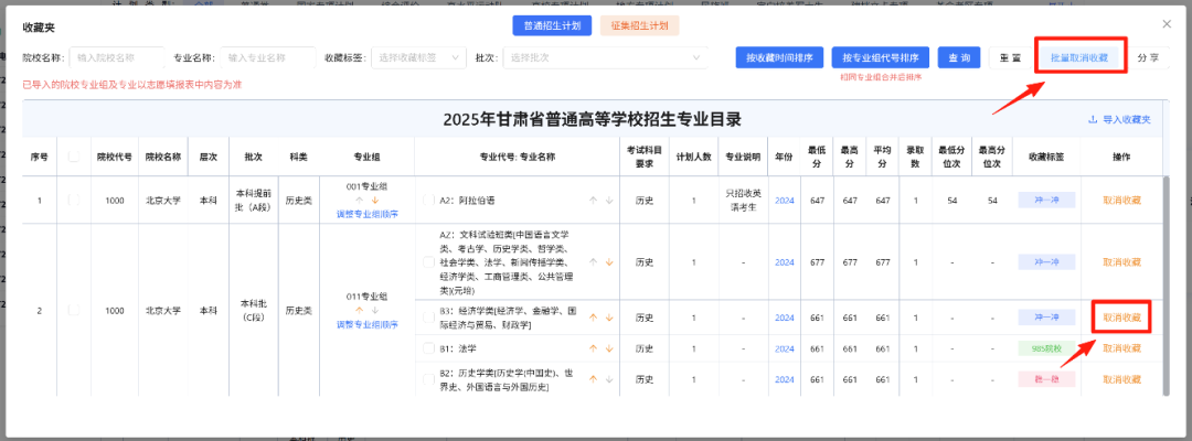 如需要取消收藏专业,则点击专业右侧“取消收藏”按钮,或者勾选需要取消的专业选择框,点击收藏夹右上方“批量取消收藏”按钮即可取消。