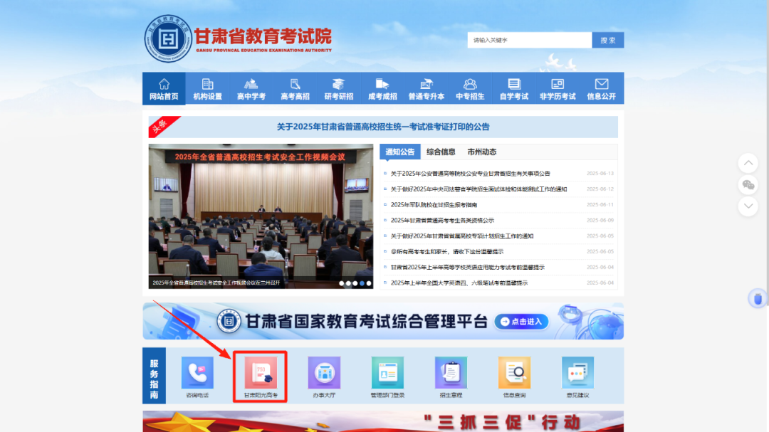 考生可登录甘肃省教育考试院官网(https://www.ganseea.cn),点击“甘肃阳光高考”图标进入甘肃阳光高考信息平台,或者在浏览器直接输入网址https://kw.ganseea.cn/yggk进入甘肃阳光高考信息平台。
