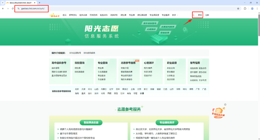 考生可访问教育部阳光志愿信息服务系统(网址:https://gaokao.chsi.com.cn/zyck/),点击右上角“登录”按钮进行登录。