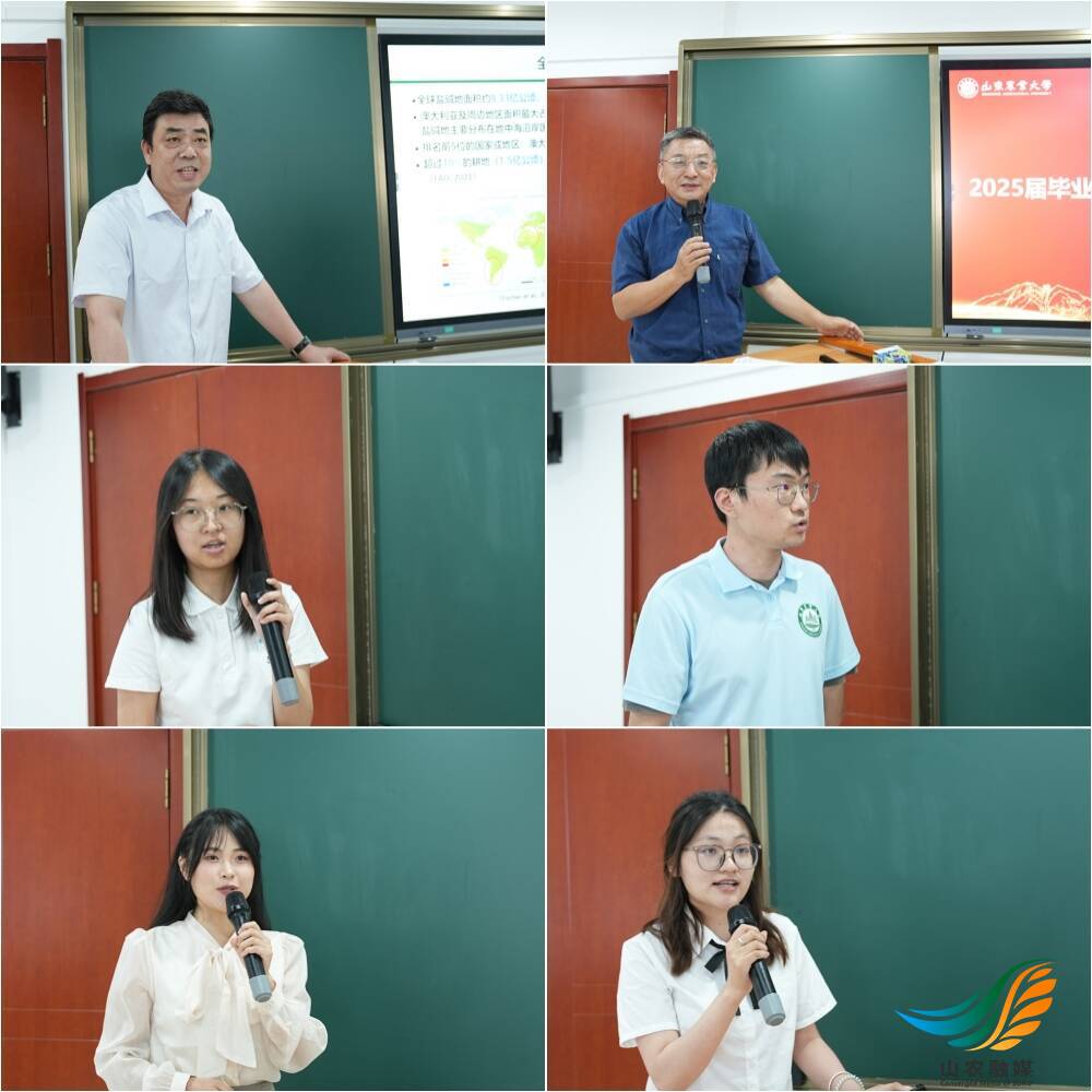 王涛、杨长军针对同学们的汇报内容一一作点评发言。他们认为,学校引导广大师生深入田间地头、产业一线,聚焦产业发展需求,开展课题研究,是落实厚植爱农情怀、练就兴农本领的具体实践。而这一“产区模式”打破了传统专业毕业汇报的壁垒,对学生全面发展极为有益,值得推广学习。汇报会上,学校2025届毕业生盐碱地产业“总指导”诸葛玉平从山东省盐碱地资源概括、盐碱地综合利用存在的问题、盐碱地综合利用路径和技术,以及盐碱地等方面作了专题报告。来自资环学院、生科学院、园艺学院、农学院等8个学院、10个专业的10位毕业生,结合各自专业,围绕盐碱地土壤硝化过程微生物研究、盐碱地质量与产能提升、耐盐碱作物品种筛选及配套栽培技术等盐碱地产业发展存在的问题,给出了各自的优化解决方案,用实际行动践行盐碱地综合利用的使命。