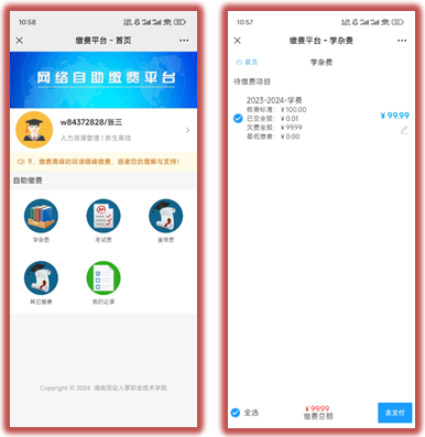 2、登录成功之后进入主页面,学生可以通过不同的缴费入口,缴纳自己需要缴费的项目。(以学杂费为例,点击学杂费入口,进入学杂费缴费页面)