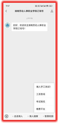 1、学生可通过关注湖南劳动人事职业学院订阅号微信公众号,在公众号页面,点击下方的智慧校园下的缴费平台菜单。