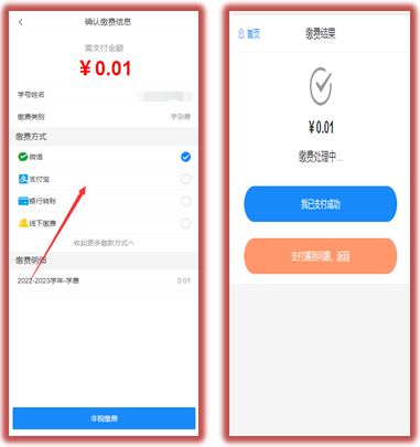 3、左边选中对应待缴费项目,确认缴费项目和金额信息选择无误之后,点击右下角去支付,跳转到订单页面。缴费方式可以选择微信或者支付宝,再点击下方非税缴费,跳转到支付页面。支付成功后点击我已支付成功返回。
