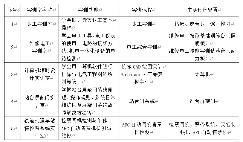 学校拥有满足正常的课程教学、实习实训所需的专业教室、实训室和实训基地。有较好的多媒体计算机、投影设备、音响设备,互联网接入和WiFi 环境,并具有网络安全防护措施。校内实训建设有站台屏蔽门实训室、轨道交通CBTC信号控制及运营管理仿真沙盘、维修电工技能实训室、计算机辅助设计实训室、光机电一体化实训室、钳工实验室、数控加工制造生产车间、工业4.0智能制造生产车间等,能满足金属工艺、数控加工、维修电工、自动控制等方面的教学需要。