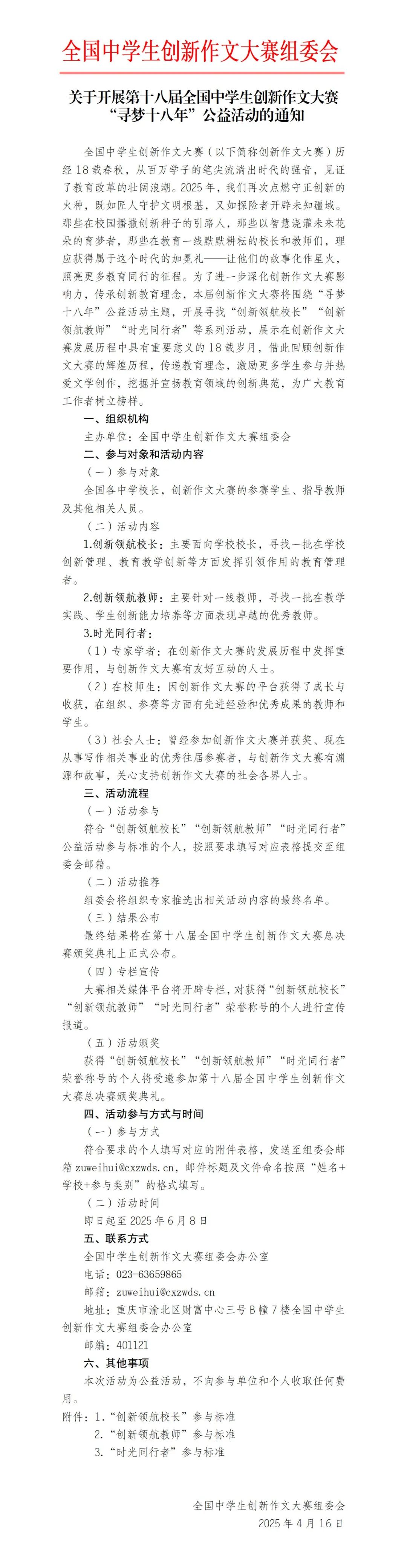 经组委会研究决定,第十八届全国中学生创新作文大赛“寻梦十八年”公益活动截止时间延长至2025年7月11日,活动其他内容不变,请有意愿参与活动的人员在规定时间内提交相关表格。活动具体内容展示如下: