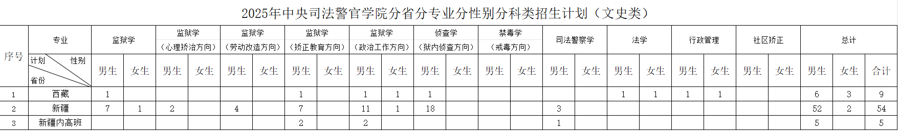 2025年中央司法警官学院分省分专业分性别分科类招生计划(文史类)