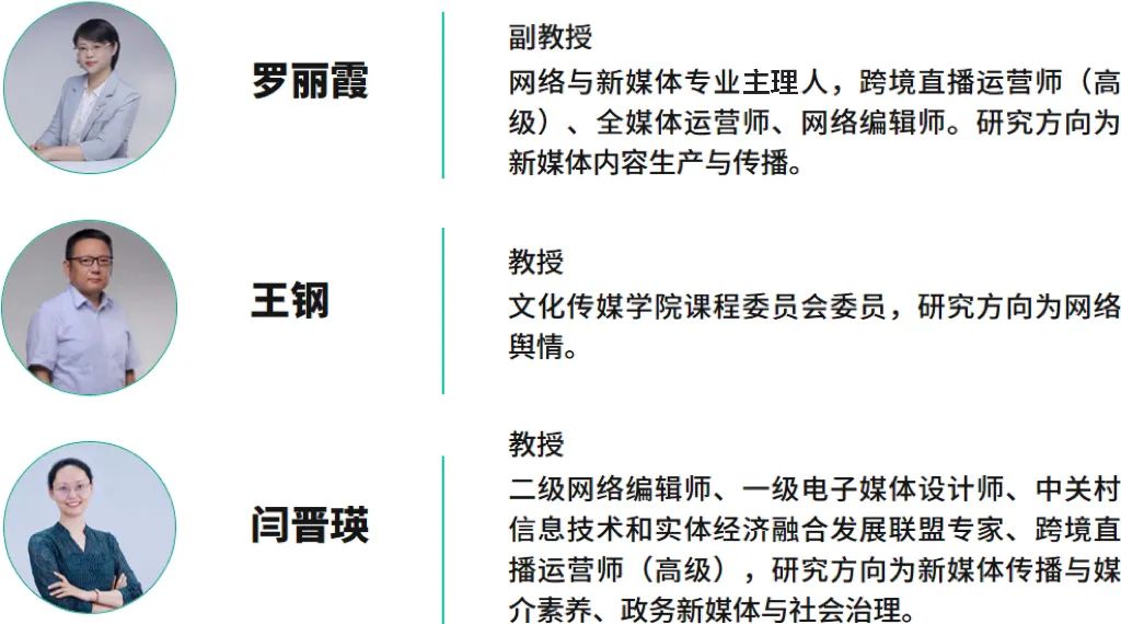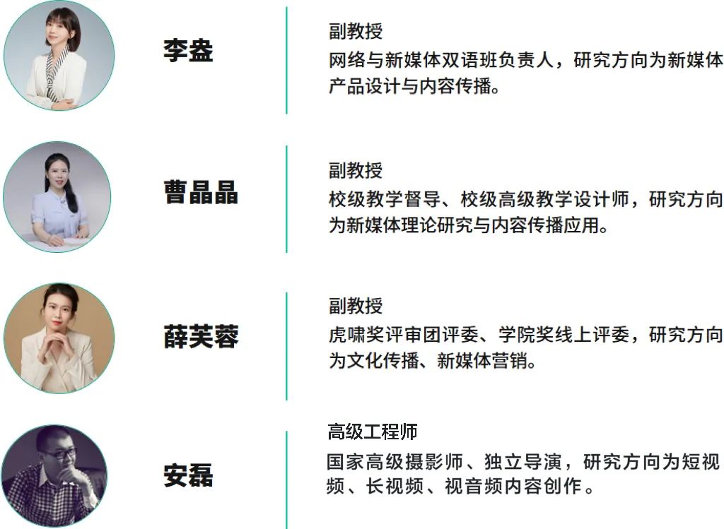 网络与新媒体专业具有一支业务精湛、师德高尚、教学经验丰富的跨学科专职教师团队,团队成员的学科背景涵盖新闻传播学、软件工程、营销策划、马克思理论教育等领域,精准匹配应用型高质量人才培养需求。他们不仅是知识的传授者,更是实践的引路人,为锻造未来智媒精英提供了最强保障!