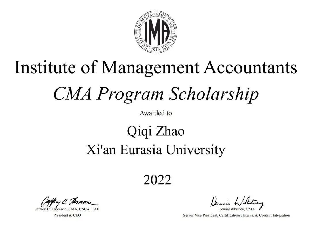西安欧亚学院会计金融学院财务管理专业持续和IMA(美国管理会计师协会)开展CMA(注册管理会计师)奖学金项目的合作。近三年,共有11名学生获CMA项目奖学金,这些同学获得免费CMA学员注册和CMA考试的机会,共有5名同学顺利通过CMA考试,成为注册管理会计师,实现了高质量就业。CMA奖学金项目表明西安欧亚学院的管理会计国际化人才培养工作和教学质量获得了IMA的高度认可。