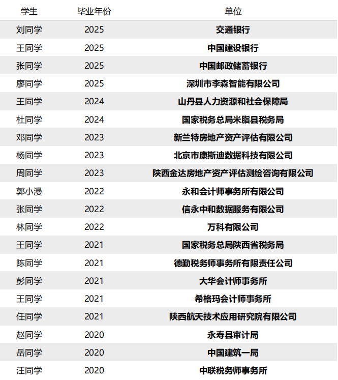 •行业资源:与金蝶、浪潮、天职国际、信永中和等知名企业深度合作,并链接西安CMA精英俱乐部企业资源,为学生提供丰富校外实习与实践机会,择优推荐学生就业。