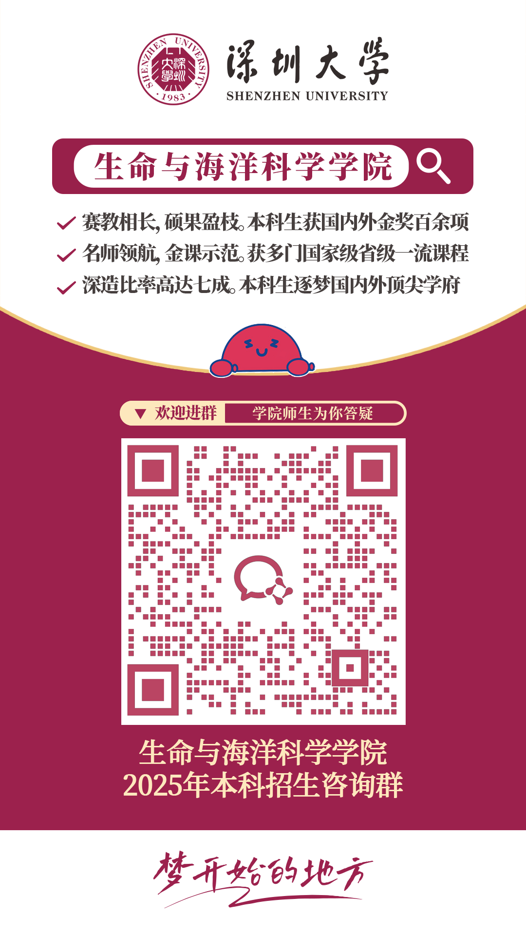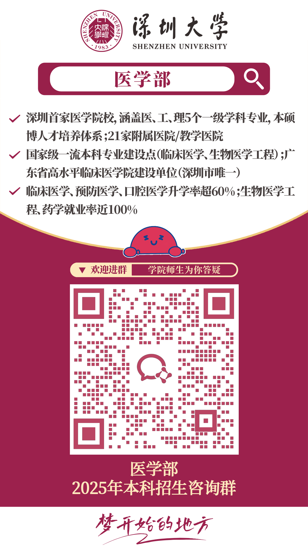 选择深大医学,你将收获无限可能:成为慈心仁术的临床医者、开拓创新的医药科学家、守卫健康的医学管理者、跨界融合的卓越医疗工程师……在这里,你将追逐“除人类之病痛,行医者之使命”的誓言,为健康中国建设贡献自己的力量!