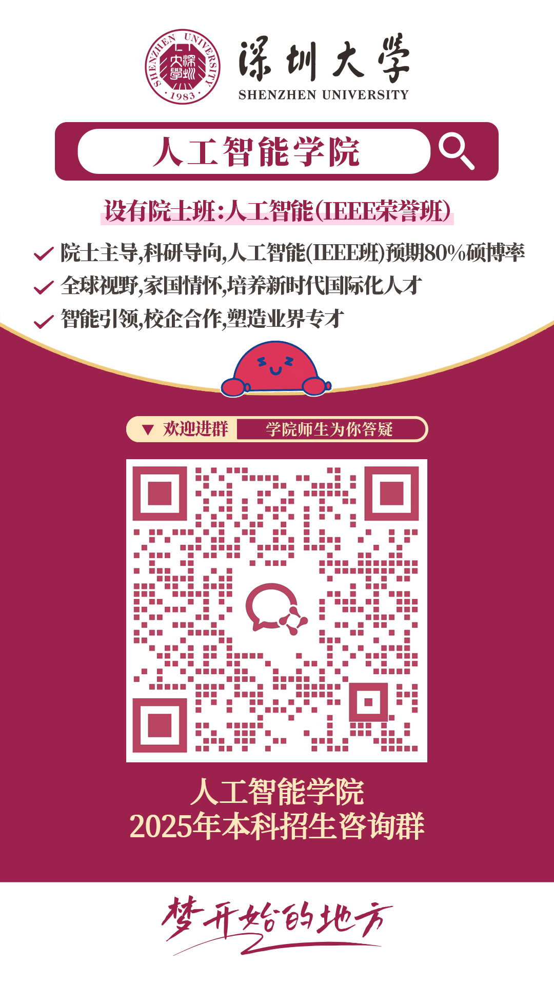 2024年,IEEE荣誉班以平均630分成为深大广东省物理类录取分数最高的专业。今年IEEE荣誉班将以人工智能学院为依托,充分利用大数据系统计算技术国家工程实验室资源,借助计算机科学与工程学两个世界ESI前千分之一的学科优势,不断探索人工智能的新领域。值得一提的是,深圳大学人工智能学科在最新US News学科排行榜中位列全球第47,科研实力再获国际认可。加入我们,你将获得院士级专家的科研指导,在国际化平台上以科研为导向,探索计算机与多学科融合的无限可能,成长为具备全球视野(International)、科研热情(Enthusiastic)、卓越成果(Excellent)、专业素养(Expert)的IEEE新时代国际科研人才。