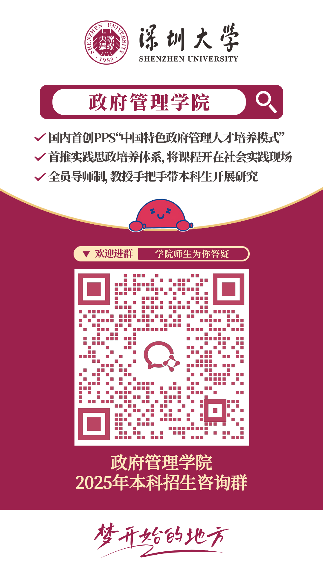 深圳大学政府管理学院,是华南地区首家以“政府管理”命名的高校二级学院。学院对标世界一流政府管理学院,高起点规划、高水平建设、高质量发展,探寻政府管理的中国之路,在世界治理格局中发出深圳声音。在这里,可以学习掌握城市治理、公共管理、社会发展等方面的前沿理论知识,可以深度参与政府机关、企事业单位、社区和公益团体的实践运作。学院文理科学生兼收,欢迎对国家与社会发展有兴趣、抱负的同学报考!