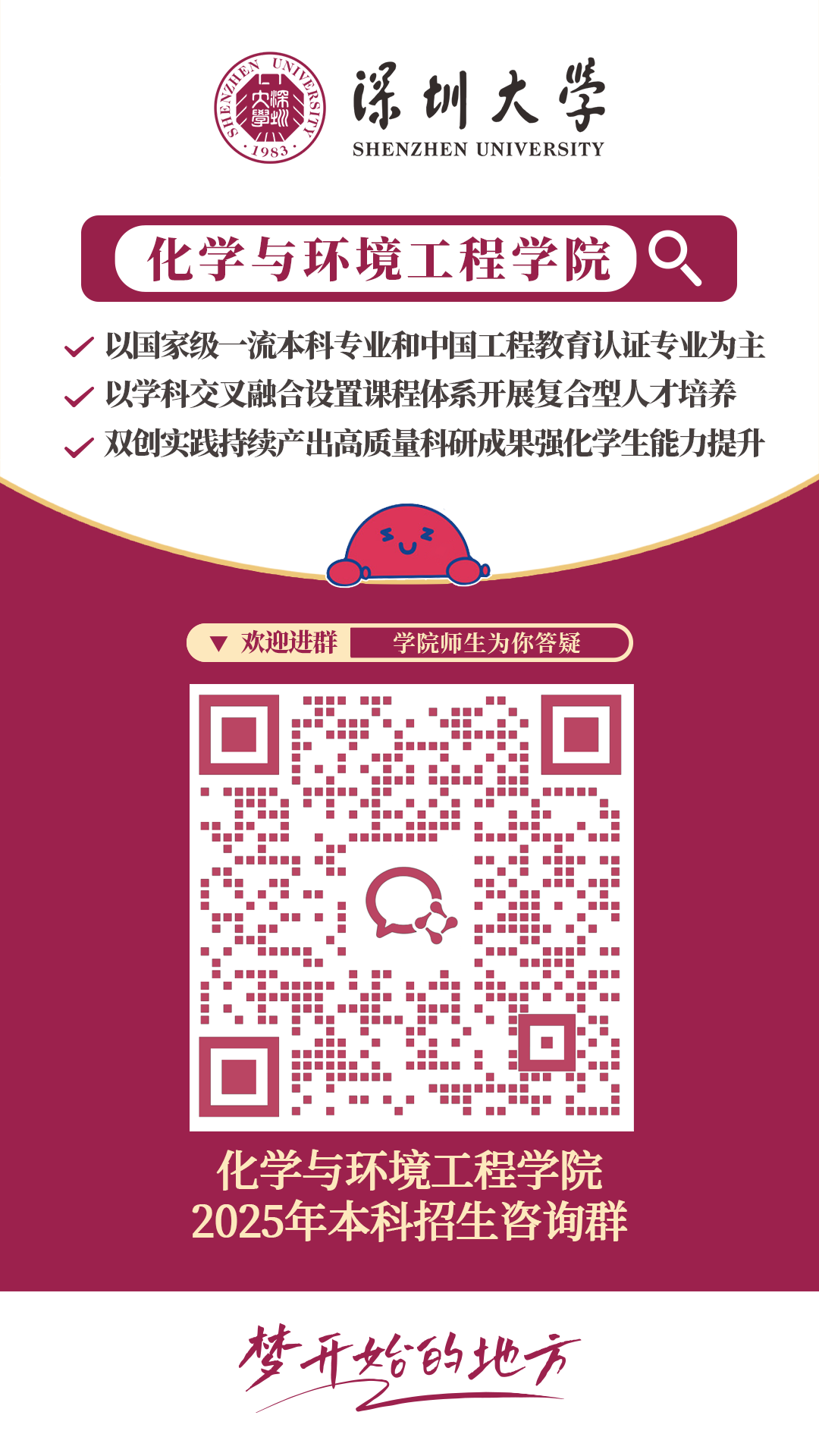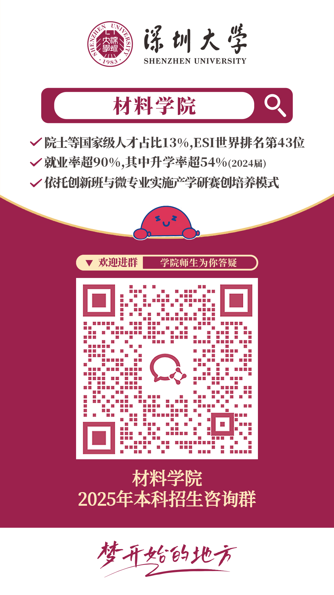 在这里,创新实验班、微专业,聚徒教学、小班制开课、学业导师制,院士、特聘教授亲自授课、手把手指导,高精尖的科研实践平台和设备、丰厚的大湾区创新创业沃土、多彩的国外学习交流合作项目,终将铸就您的“材”华横溢,“料”定未来。深圳大学材料学院欢迎您,梦想您,成就您。