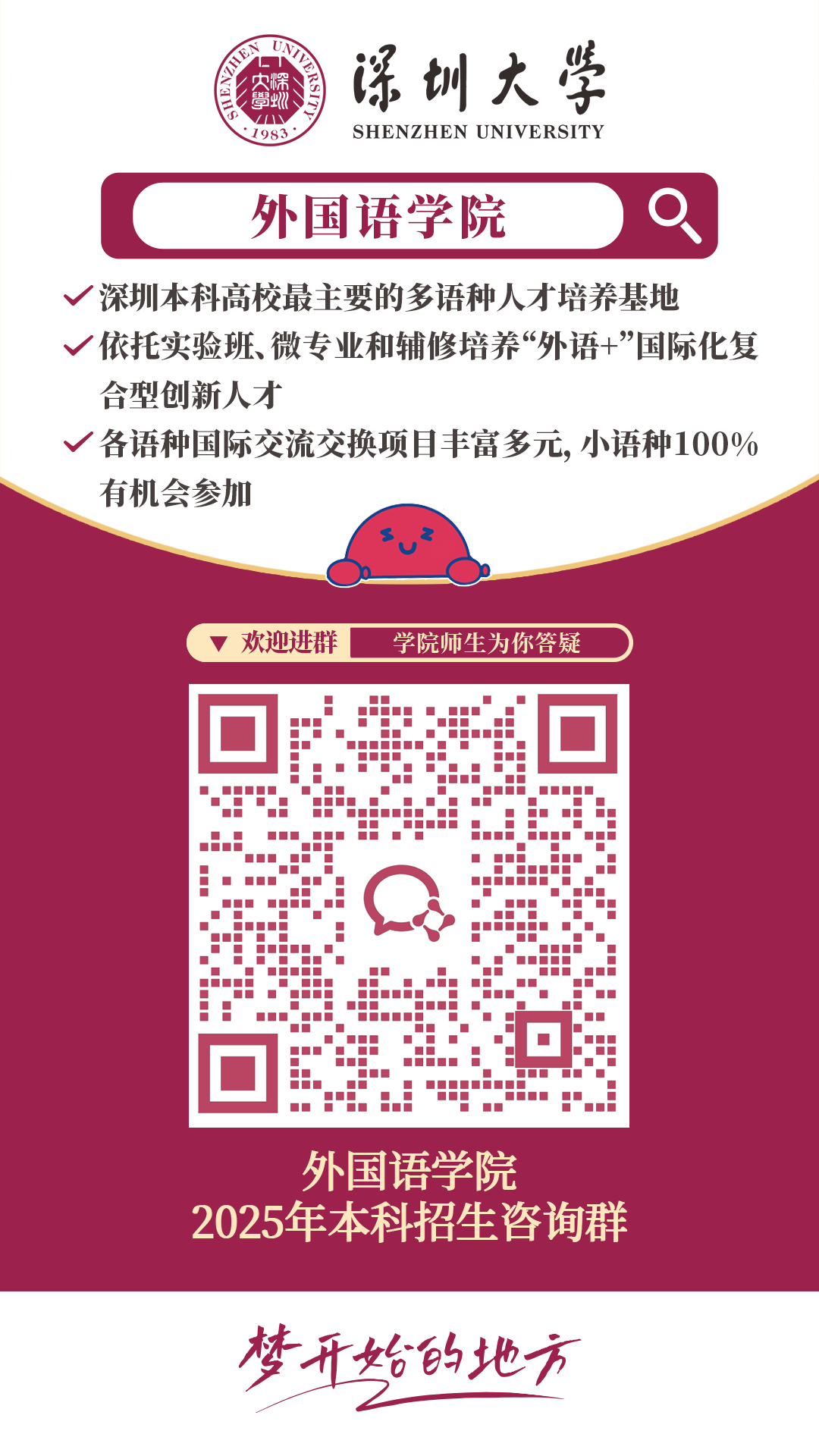 语通中外,言达世界。外国语学院践行“铸中国发展之魂,育涉外核心之才”教育使命,立足湾区,胸怀祖国,放眼世界,借新时代外语学科创新转型及AI赋能外语教学之势,以新文科建设为指引,夯外国语言文学之基石,扩交叉学科之视野,拓外语赋能之潜力,以“外语+AI+专业”为抓手,坚持“厚基础、宽口径、差异化”发展路径,培养以“外语赋能”和“AI赋能”为特色的国际化创新型复合人才。学院人才培养体系完备、办学设施一流、学习环境优越、国际化程度高。深湾大鹏,“圳”等您来!欢迎报考深圳大学外国语学院!