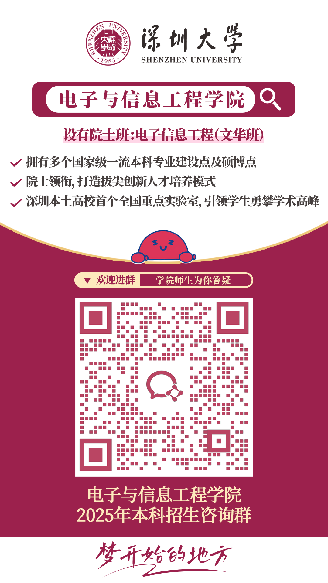 电子赋能生活,信息承载梦想;通信连接你我,网络互联万物。科技的力量正在以前所未有的速度改变世界,而电子信息类专业正是掌握这种力量的关键。在深圳大学电子与信息工程学院,我们将向大家呈现完整的电子信息知识体系。生动的课堂、有趣的实践、创新的培养模式助你快速成长。用电路板刻画梦想,让示波器映射希望,加入我们,一起“电”亮科创未来,逐梦“信”辰大海!