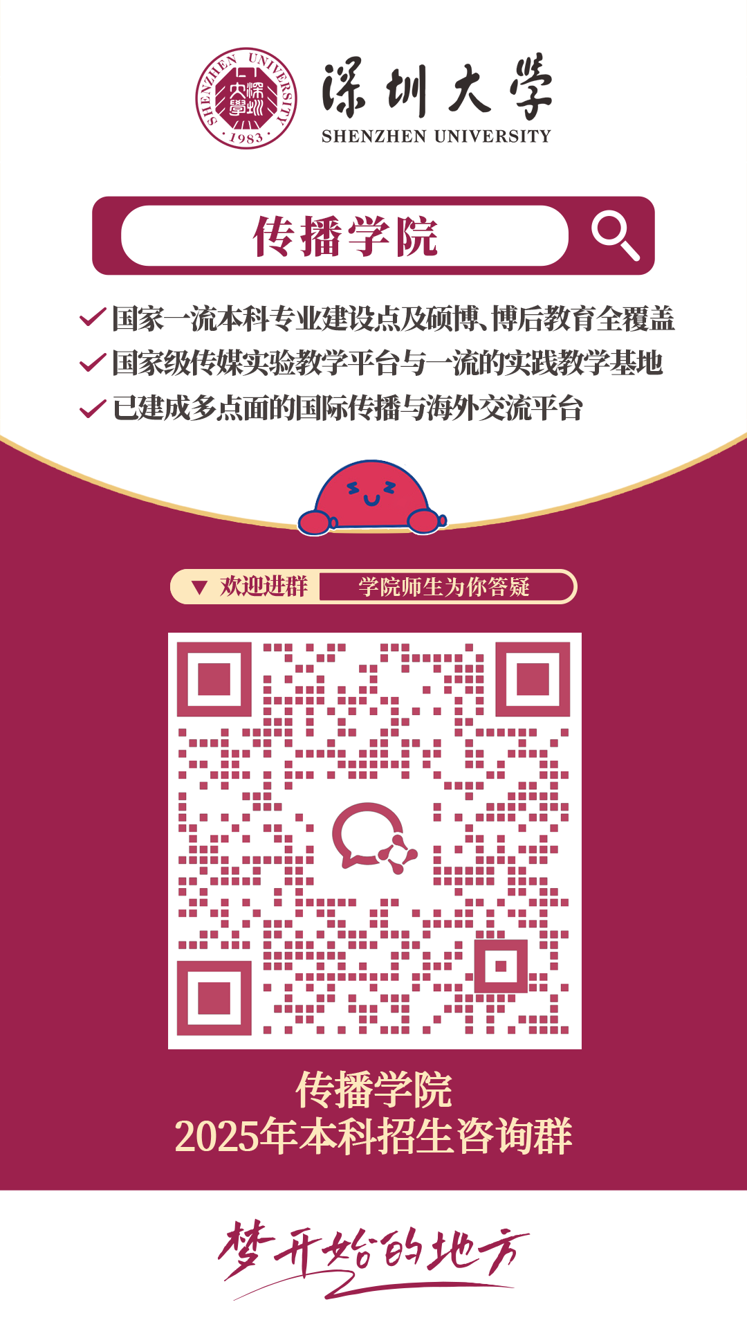 文以载道,传以致远。传播学院是深圳大学最富活力与朝气的学院之一,拥有广告学、新闻学、网络与新媒体三个国家级一流本科专业,建有国家级传媒实验教学示范中心。学院具有新闻传播学一级学科博士学位授予权,一级学科硕士学位授予权、专业硕士学位授予权及新闻传播学博士后流动站。随着粤港澳大湾区和社会主义先行示范区的建设和推进,学院全力以赴,不负韶华,等待优秀的你,一起熠熠闪光,共创精彩未来。