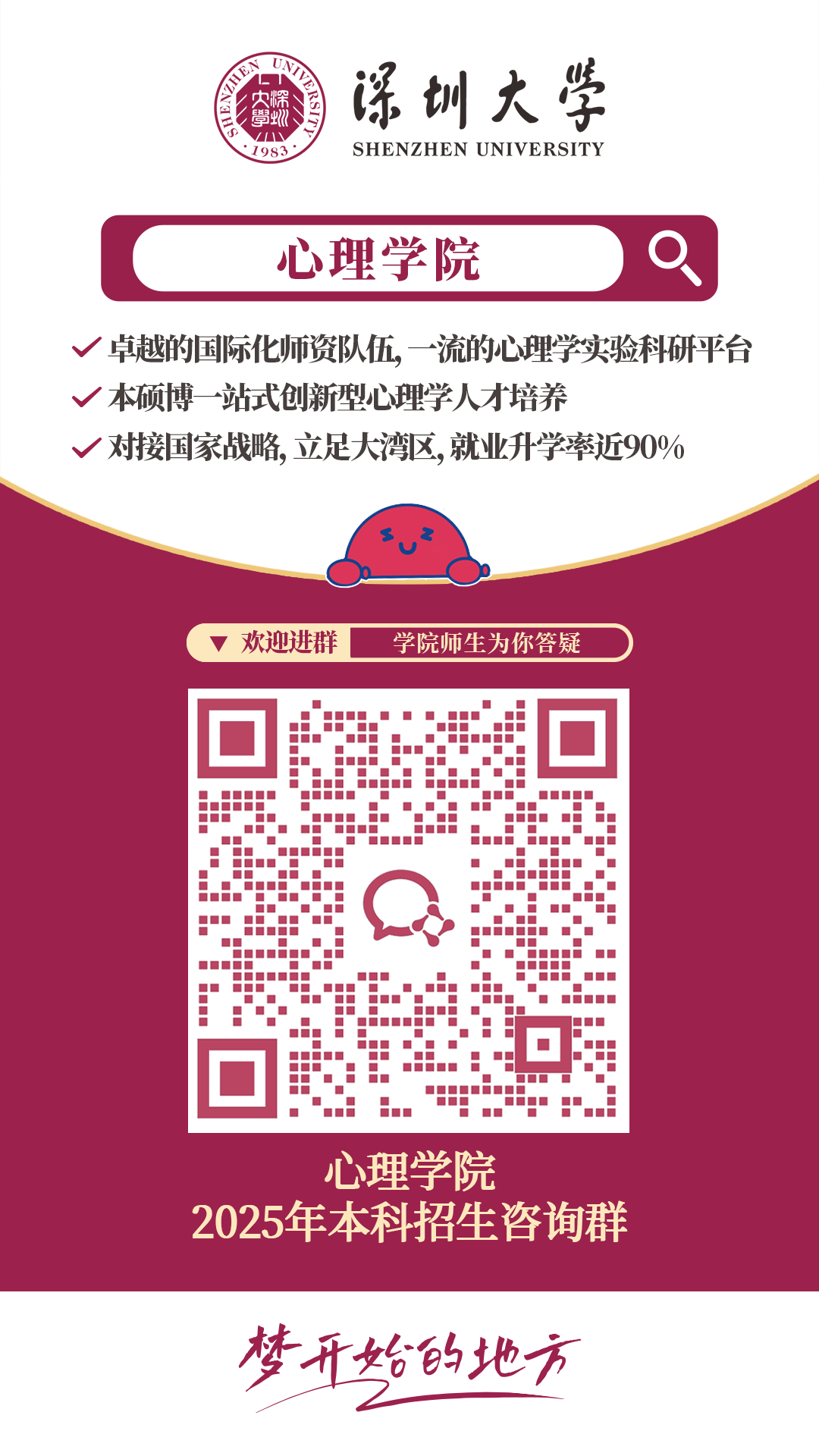 学院对接国家战略,立足大湾区,以卓越的国际化师资队伍、一流的科研实践平台进行本硕博一站式创新型心理学人才培养,为你的心理学旅程保驾护航。在这里,你将深入心理学的神圣殿堂,探索大脑与生命的深邃之谜。未来无界,就从这里起航!