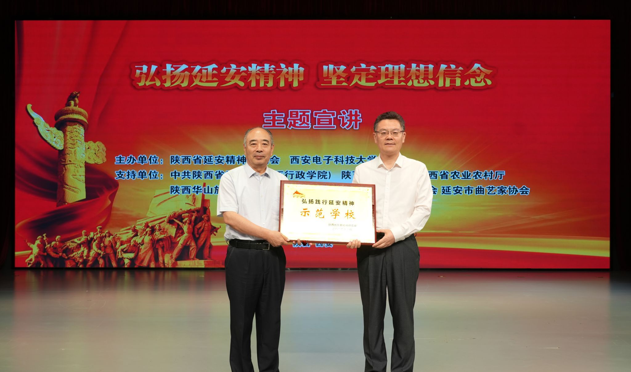 在授牌仪式环节,任小龙代表学校从梁宏贤手中接过了研究会授予的“弘扬践行延安精神示范学校”荣誉牌。