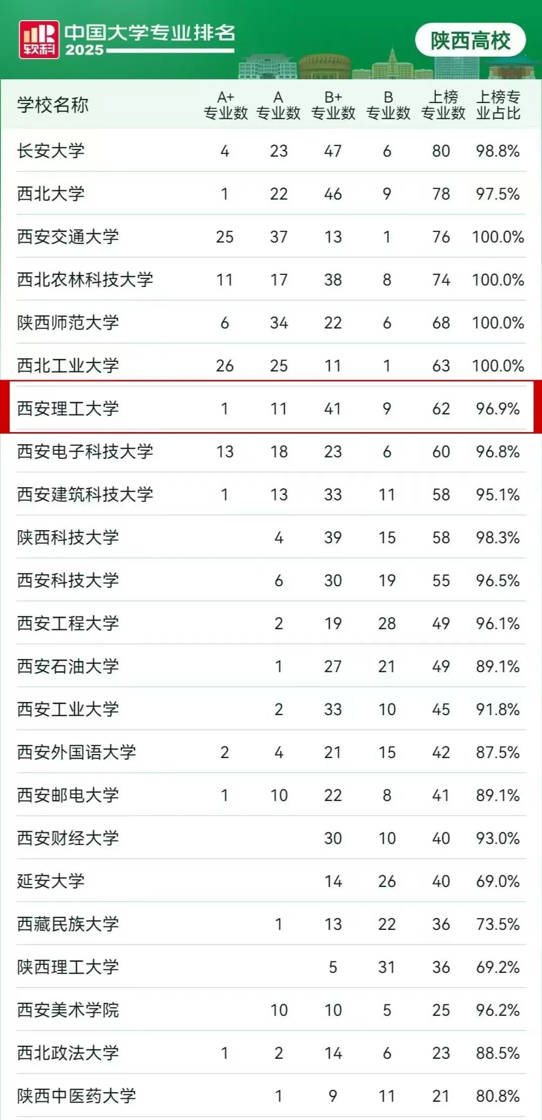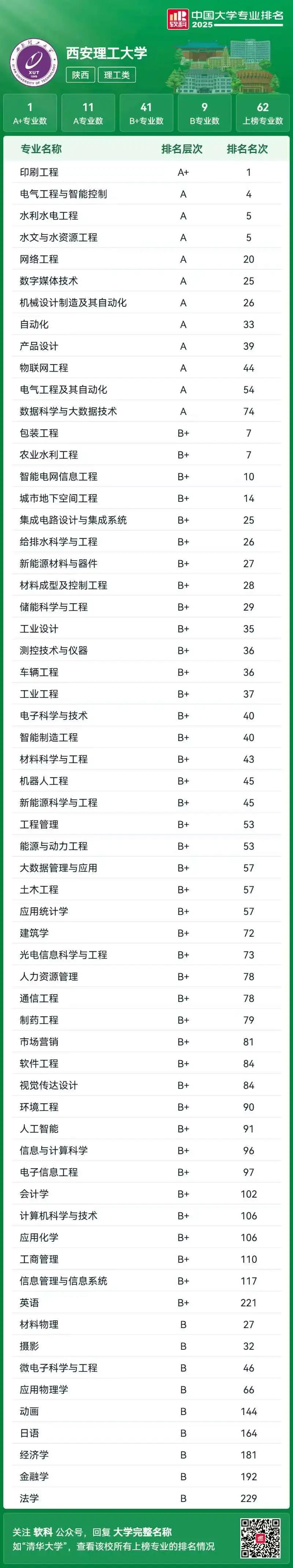 西安理工大学62个专业上榜,专业排名持续位居省属同类高校第一。其中A+专业数1个,A专业数11个,B+专业数41个,B专业数9个,上榜专业占比96.9%。