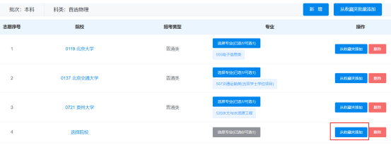 也可以点击“从收藏夹添加”按钮,将已经收藏的院校专业导入某个志愿。