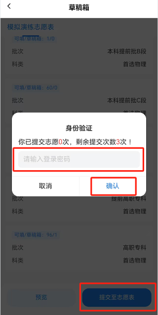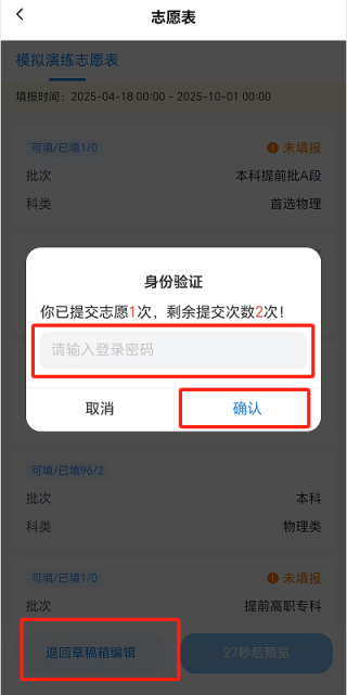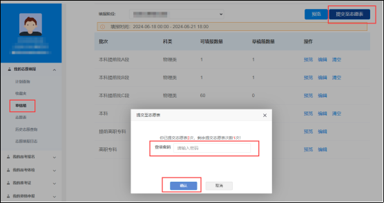 考生若需修改已提交志愿,可通过“志愿表”→“退回草稿箱编辑”,将已提交志愿退回至草稿箱。此时系统会要求输入登录密码,并提示已提交志愿表次数和剩余可提交次数。