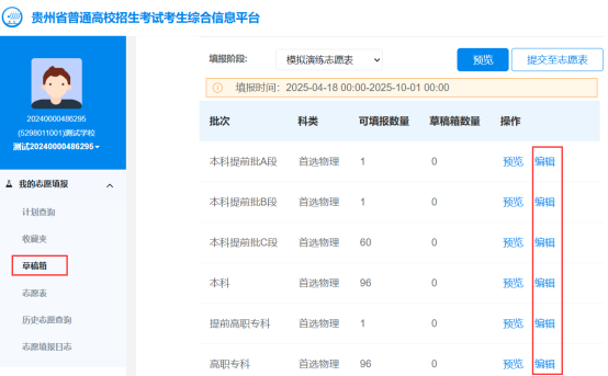 点击批次的“编辑”按钮,开始编辑对应批次志愿草稿。