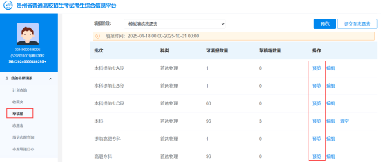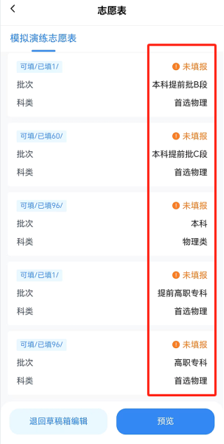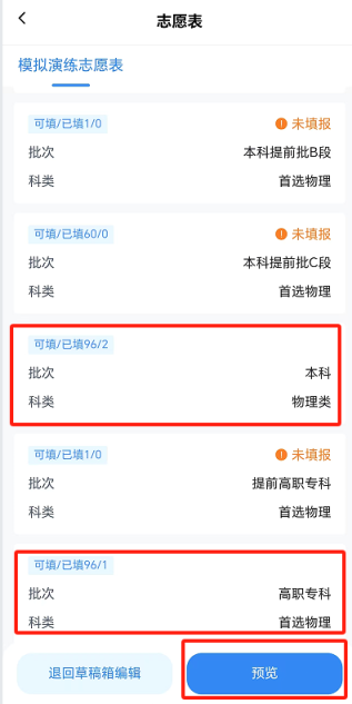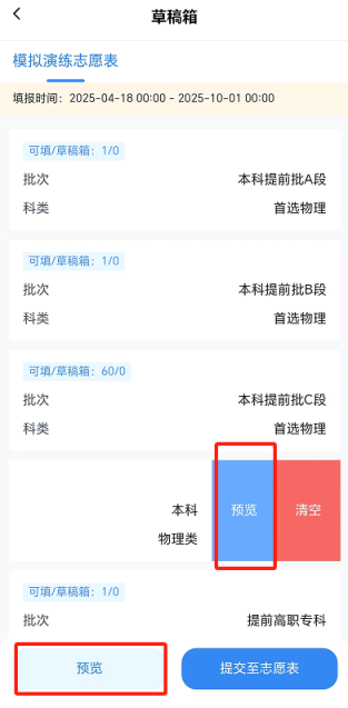 考生保存志愿草稿后,在“草稿箱”中向左滑动批次区域,点击“预览”按钮核对志愿草稿。在正式提交志愿前,可对志愿草稿进行修改。务必逐条核对志愿信息,包括核对院校代号、院校名称、专业代号、专业名称以及志愿顺序等。