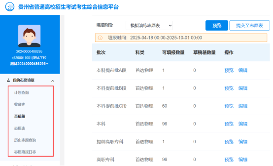 考生填报志愿时须先在“草稿箱”中编辑志愿草稿。