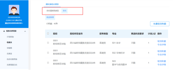 在“收藏夹”中,可以通过切换上方选项卡查看自己收藏的各个批次的专业计划。