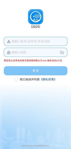 考生下载最新版本“贵州招考”移动端APP(可通过华为应用市场、苹果App Store或腾讯应用宝下载安装),按要求输入身份证号及密码登录系统。