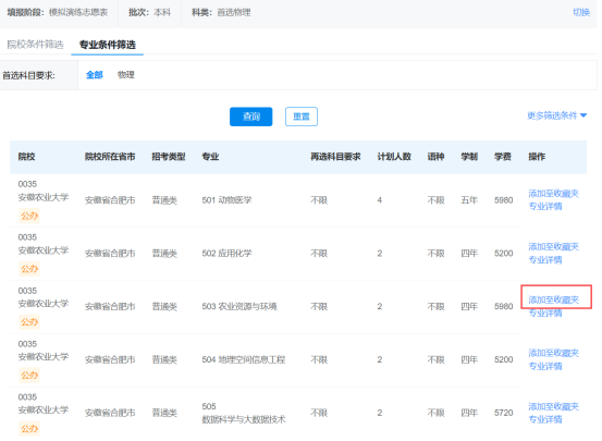 考生在计划查询过程中,可将感兴趣的专业进行收藏。