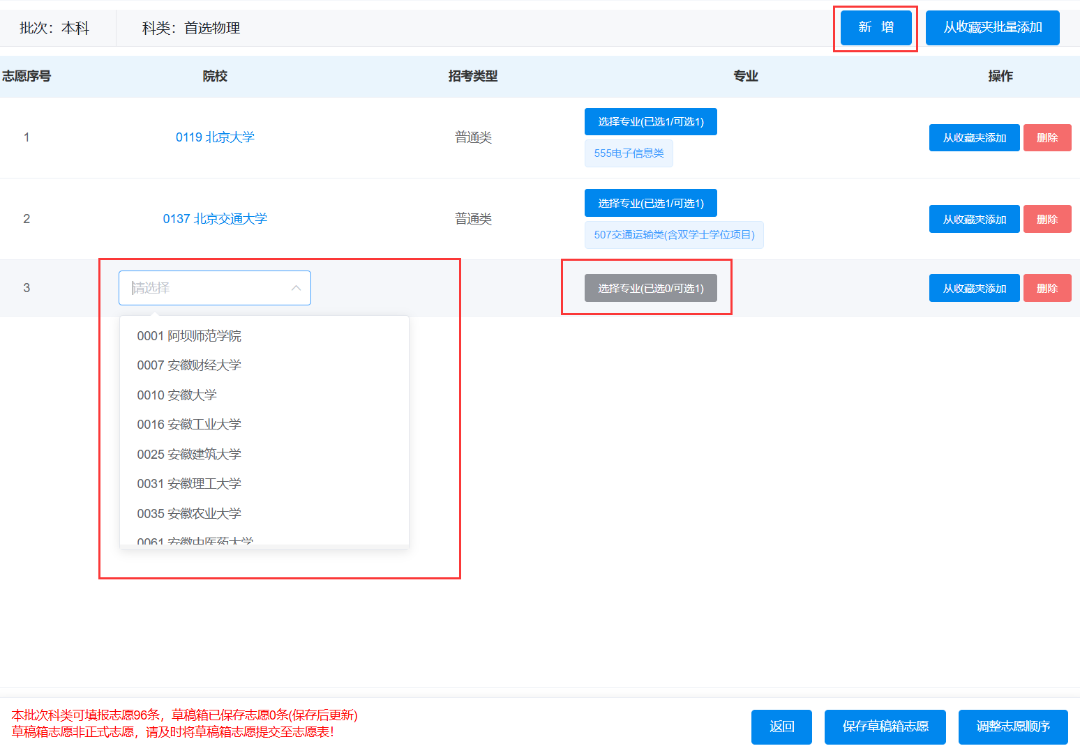 在“编辑”页面,考生可以点击“新增”按钮,逐条填选院校及专业。