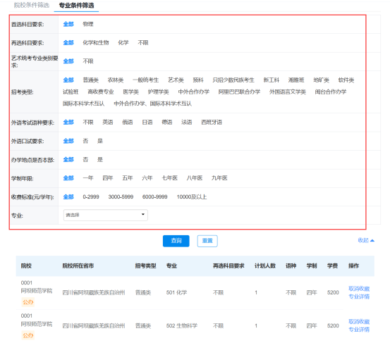 需要注意,如果先筛选查询了院校,再进行专业条件筛选时,筛选结果为前面筛选院校的相关专业,可以点击“重置”清空查询条件。