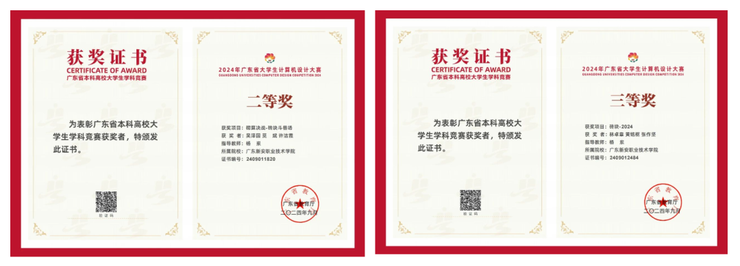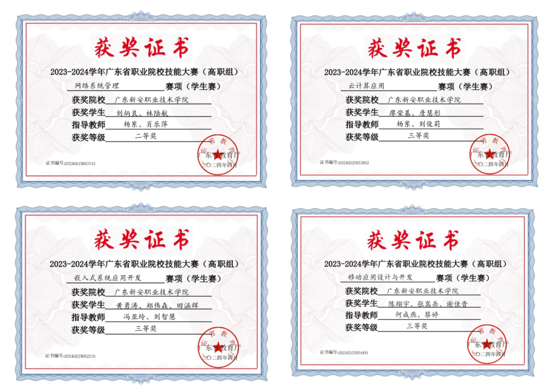 近两年,在广东省技能大赛中,获得大数据技术与应用一等奖、三等奖,云计算二等奖、三等奖,移动应用开发二等奖、三等奖等,网络系统管理二等奖等等多个赛项的好成绩,在广东省大学生计算机设计大赛获人工智能二等奖、三等奖等,获得深圳市小程序开发,云计算、区块链、大数据等多个赛项的一等奖、二等奖、三等奖共三十余项。