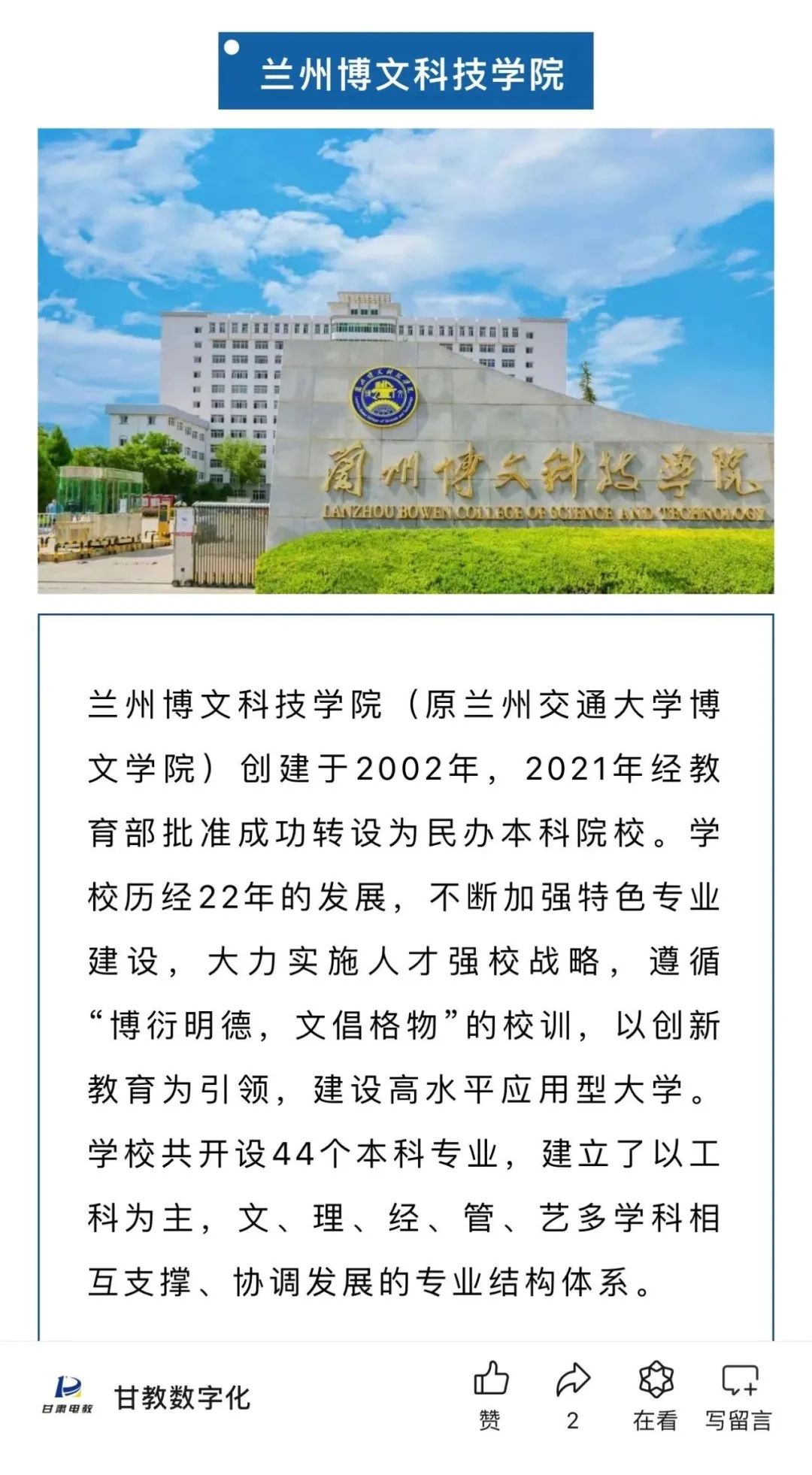 兰州博文科技学院(原兰州交通大学博文学院)2002年由兰州交通大学申办成立,2004年被国家教育部确认为独立院校,属全日制普通本科高等院校,2021年经教育部批准转设为兰州博文科技学院。