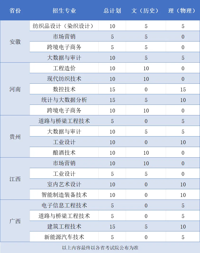 浙江工业职业技术学院2025年外省分专业招生计划