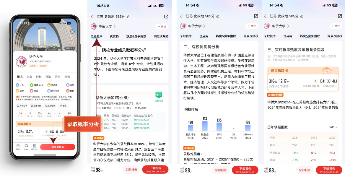 如果你想精准匹配院校了解各专业录取分数趋势、招生计划,或是研究报告等信息查询,可直接通过优志愿APP实现,输入分数可直接通过“测录取概率”看到优劣势、学校热度、竞争指数等看考生是否可以填报。