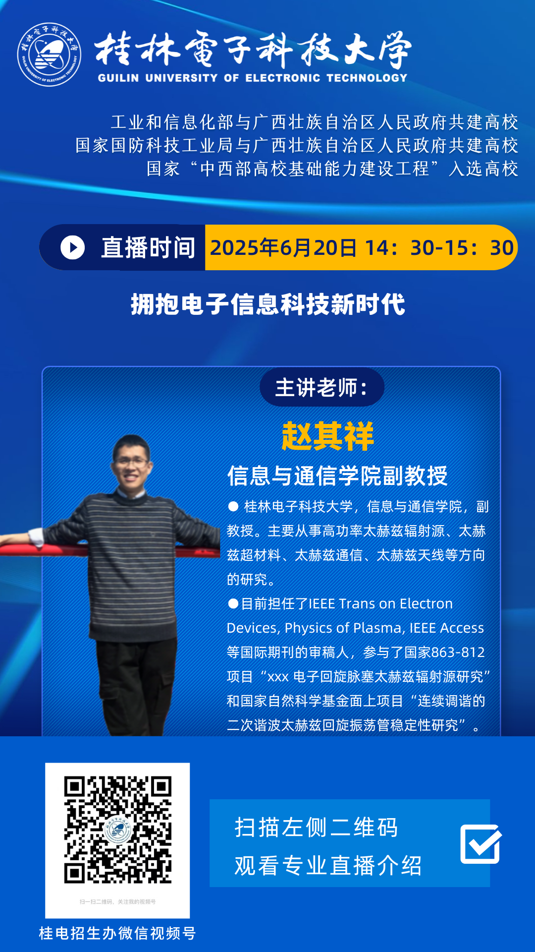 赵其祥,桂林电子科技大学,信息与通信学院,副教授。主要从事高功率太赫兹辐射源、太赫兹超材料、太赫兹通信、太赫兹天线等方向的研究,取得了一定的成果:以第一作者身份发表学术论文15 篇,其中IEEE Trans on Electron Devices 2 篇,Physics of Plasma 2 篇,Euphysics Letters 1 篇;目前担任了IEEE Trans on Electron Devices, Physics of Plasma, IEEE Access等国际期刊的审稿人,参与了国家863-812项目“xxx 电子回旋脉塞太赫兹辐射源研究”和国家自然科学基金面上项目“连续调谐的二次谐波太赫兹回旋振荡管稳定性研究”;目前正主持国家自然科学基金项目“高功率太赫兹回旋振荡器失谐过程模式竞争机理的研究”,广西青年科学基金项目“面向DNP-NMR应用的宽带宽连续调谐太赫兹回旋振荡管关键技术的研究”,广西科技基地和人才专项“基于超材料的新型THz辐射源研究”、国防科工局重点实验室稳定支持项目“Ka波段非超导磁体二次谐波大回旋行波放大器研究”和广西壮族自治区认知无线电重点实验室项目“宽带宽连续调谐THz回旋振荡器关键技术研究”。经过多年研究,在太赫兹技术领域积累了扎实的理论基础。