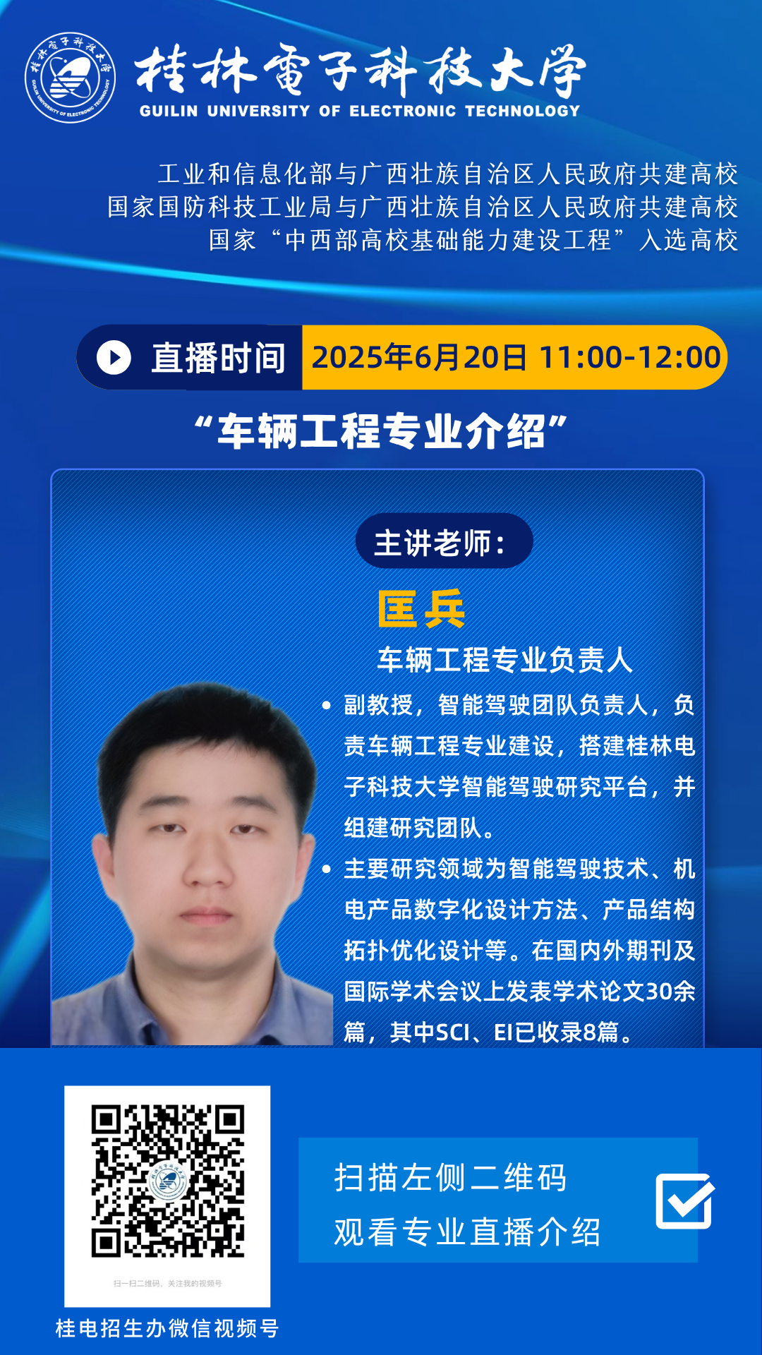 匡兵,副教授,车辆工程专业负责人,智能驾驶团队负责人负责车辆工程专业建设,搭建桂林电子科技大学智能驾驶研究平台,并组建研究团队。基于自主研发的智能驾驶技术,2019年开始与广西汽车集团合作陆续推出无人零售车和移动充电桩产品。主要研究领域为智能驾驶技术、机电产品数字化设计方法、产品结构拓扑优化设计等。在国内外期刊及国际学术会议上发表学术论文30余篇,其中SCI、EI已收录8篇。
